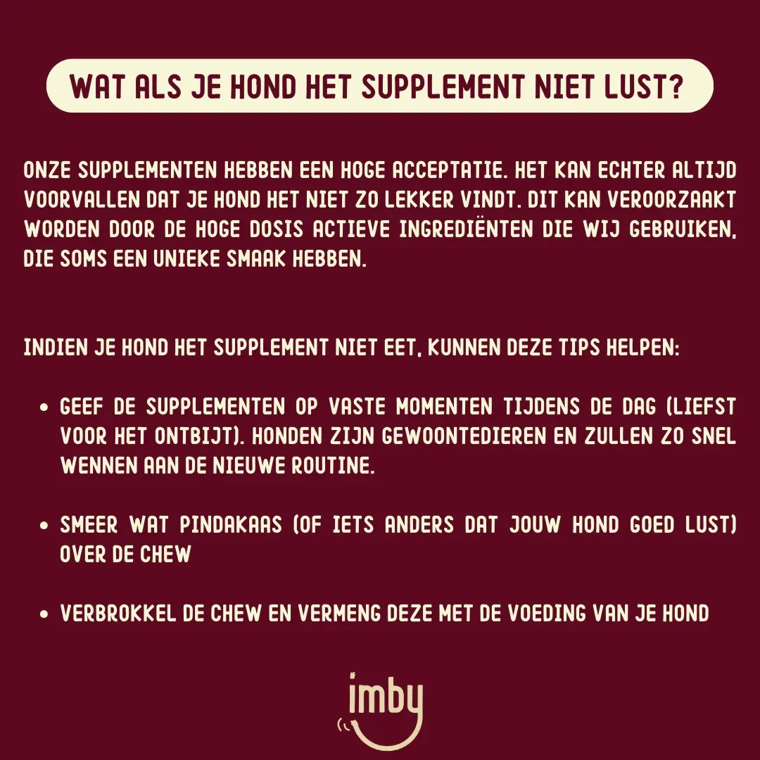 Elke pot Imby Allergy & Anti-Itch Supplement bevat 90 zachte chews. Afhankelijk van de grootte van de hond gaat een pot gemiddeld 15-45 dagen mee.