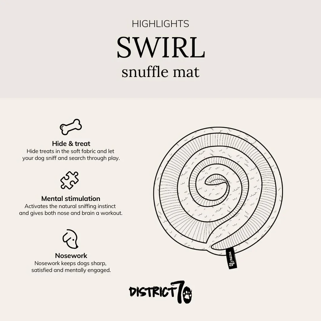 De District 70 SWIRL is een stijlvolle en functionele snuffelmat die inspeelt op het natuurlijke speurgedrag van honden. Door brokjes of snacks te verstoppen tussen de zachte ribstof en teddy stof, wordt de hond op een speelse manier uitgedaagd om te zoeken. Ideaal voor dagelijkse verrijking, het verminderen van verveling en het bevorderen van rustig gedrag.