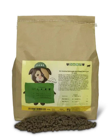 DARF-Vol Pup is compleet droogvoer voor je pup. Afkomstig uit onze eigen slagerij en gemaakt van verschillende diersoorten. DARF-Vol Pup zijn natuurlijke hondenbrokken: een verantwoorde en makkelijke vervanger voor vers vlees. Onze hondenbrokken zijn glutenvrij en bestaan voor 60% uit vers vlees.
