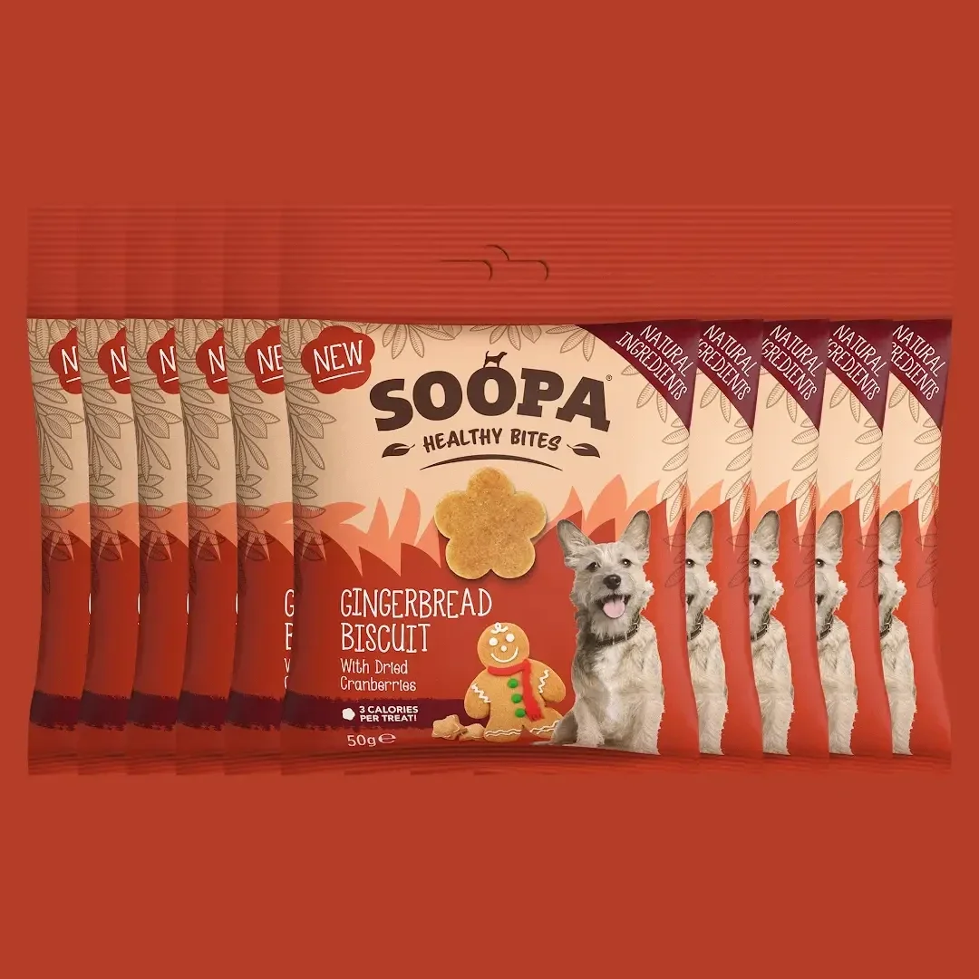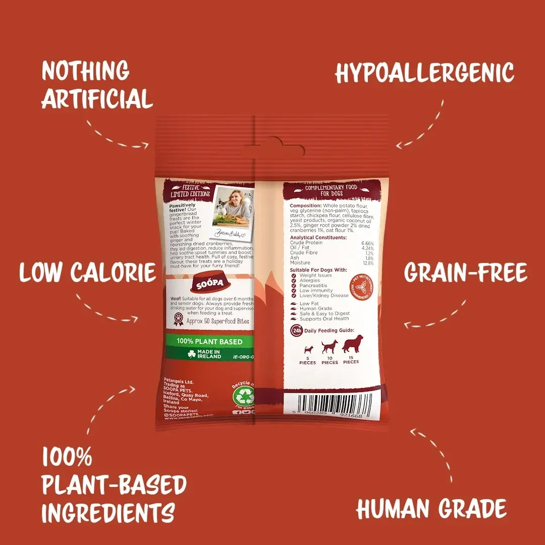 Op zoek naar een heerlijke hondensnack die ook nog eens gezond is? Passief feestelijk! Onze Gingerbread-traktaties zijn de perfecte wintersnack voor je pup! Gebakken met kalmerende gember en voedende veenbessen bevorderen ze de spijsvertering, verminderen ze ontstekingen, helpen ze maagklachten te verzachten en verbeteren ze de gezondheid van de urinewegen. Deze lekkernijen hebben een gezellige, feestelijke smaak en zijn een must-have voor de feestdagen voor je harige vriend! Slechts 3 calorieën per hap! Soopa Healthy Bites zijn een hypoallergene graanvrije traktatie voor de hond die graag kauwt. Ze zijn gemaakt met natuurlijke ingrediënten van menselijke kwaliteit en helpen de tanden schoon te houden en de ademhaling van honden te verbeteren. Deze lekkernijen zitten boordevol vitamines, mineralen en gezondheidsvoordelen. Eenvoudig, heerlijk, voedzaam en het beste van alles is dat honden er dol op zijn! Perfect voor de feestdagen en daarna, ze zijn een heerlijke manier om je harige vriend gelukkig en gezond te houden!